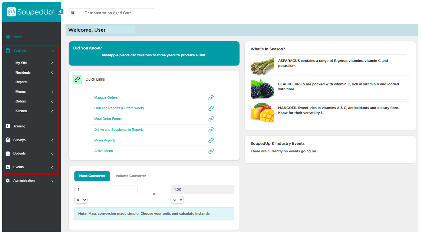 SoupedUp has five comprehensive care catering modules to choose from - Catering (which may include an integration with your Clinical Software), Training, Surveys, Budgets and Events.
